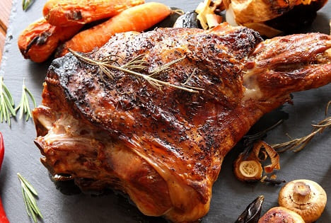 Roast in the oven for about 1.5 to 2 hours, depending on the size of the lamb. Baste occasionally with the juices from the tray.